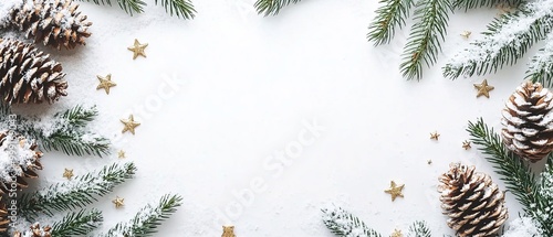 A white background with evergreen branches and pine cones dusted with snow and gold stars.