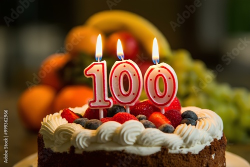A close-up of a birthday cake adorned with fruits and glistening number '100' candles, symbolizing a grand celebration of 100 years.|フルーツと輝く数字の「100」のろうそくで飾られたバースデーケーキのクローズアップで、100年の盛大なお祝いを象徴している。