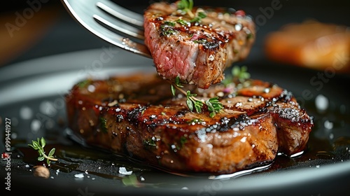 A large fork holding up the meat on top of an iron plate, the entire piece is in a frontal view, the steak has some tiny herbs hanging from its edges.