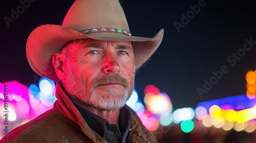 A cowboy stands confidently at an outdoor festival, surrounded by colorful lights and a festive ambiance in the evening