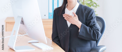 胸に手を当てるビジネスウーマン