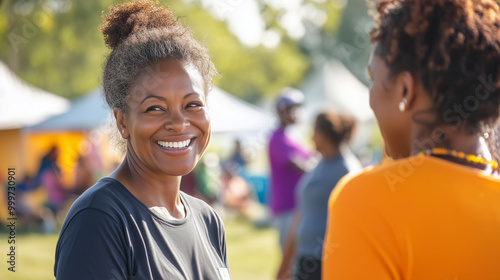 Kobiety z uśmiechem na twarzy uczestniczą w plenerowej imprezie zdrowotnej, w otoczeniu namiotów oraz innych uczestników.
