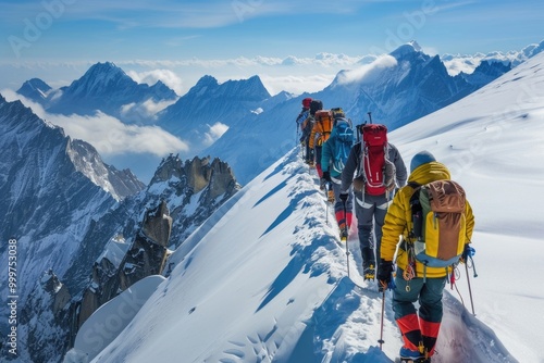 A group of people hike up a snowy mountain, enjoying the winter scenery and each other's company
