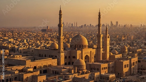 A sunset view of an Arab city skyline, with mosque silhouettes and modern buildings, framed by the warm glow of the setting sun