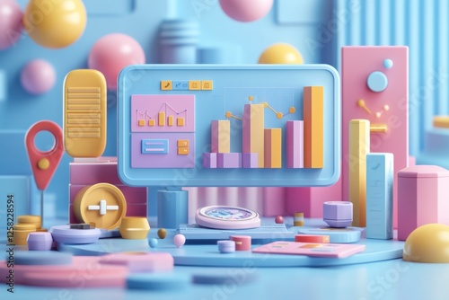 A colorful, 3D digital workspace featuring graphs, shapes, and various design elements in pastel shades of pink, blue, and yellow.