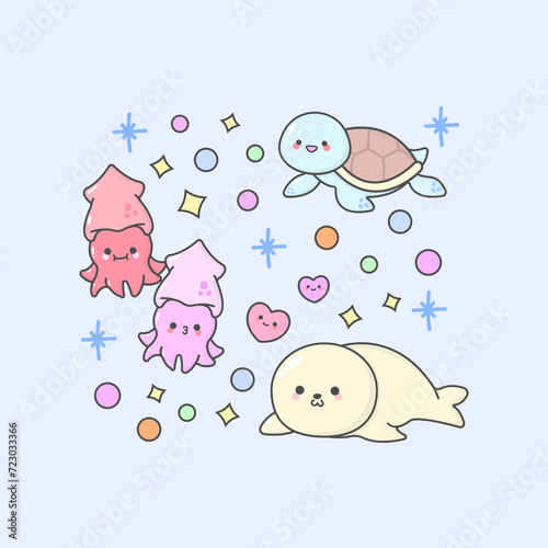 Vector Underwater Sea Animal Turtle Squid Seagul with cute facial expressions and pastel colour