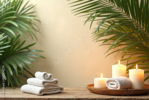 A spa therapy background featuring a tranquil setting with warm towels, essential oils, and glowing aromatherapy candles..