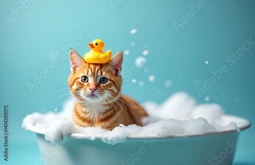 Ginger cat with yellow rubber duck on head in bathtub full of foam, bubbles. Funny, cute kitten taking bath. Domestic pet in bathroom. Hygiene, animal care concept.