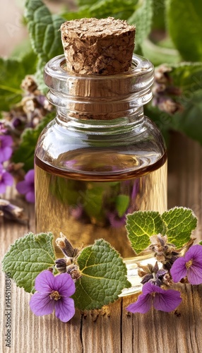 Clary Sage Essential Oil for Aromatherapy with Fresh and Dried Flowers, Rustic Wood Background.