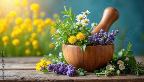 Wooden mortar with fresh herbs and colorful wildflowers. Green foliage and purple lavender are arranged in rustic bowl. Soft yellow blossoms, daisies on wooden table. Blue blurred background.