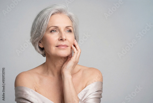 Elegant mature woman with silver hair touching her flawless skin