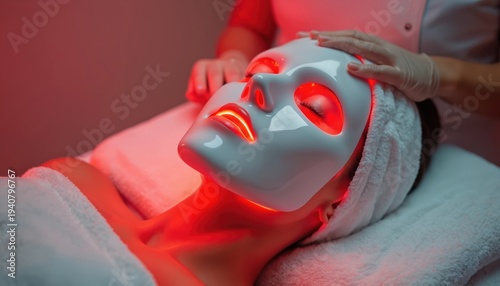 Woman in spa gets red led light facial mask therapy. Skin treatment for beauty and rejuvenation. Face care session in beauty salon for anti-aging effect.