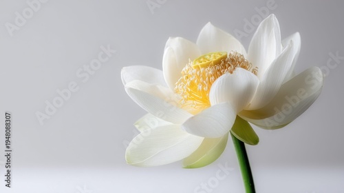 Delicate white lotus flower blooming with vibrant yellow center and green stem