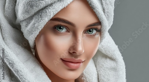 Beautiful woman with green eyes and towel wrapped around her head after a shower