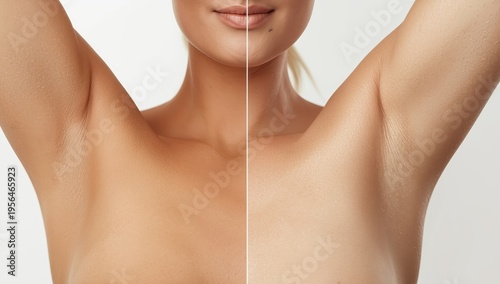 Collage of a woman’s armpit before and after hair removal, close-up on a light background.