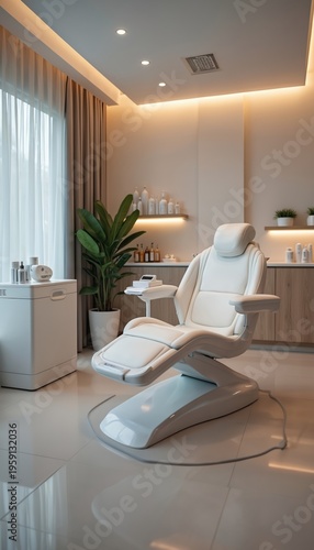 Modern clinic room with clean white treatment chair and organized shelves. Soft lighting creates serene atmosphere. Medical spa for beauty procedures. Advanced dermatology equipment awaits clients.
