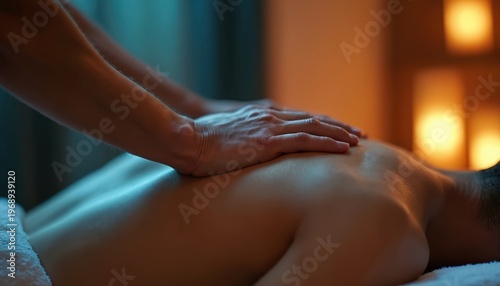 Man receiving professional back massage in dimly lit spa. Therapist hands work muscles, promoting relaxation and pain relief. Soft candle light creates serene atmosphere, aiding recovery.