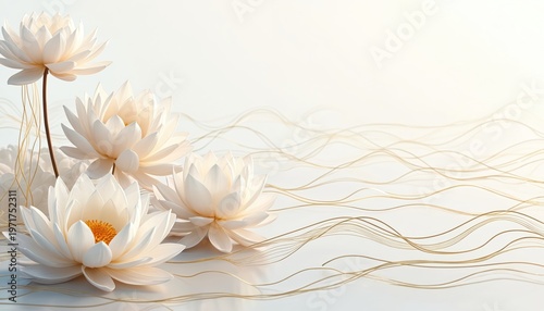Close-up on white lotus flowers with delicate gold wavy lines creating abstract serene background. Botanical blooms on water surface with graceful elegant patterns. Nature beauty, soft light,