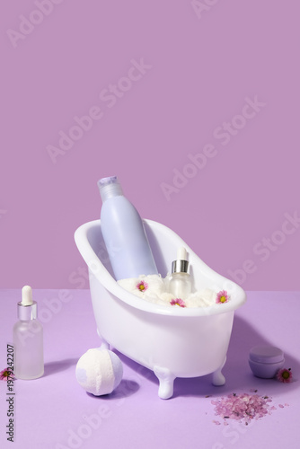 Composition with mini bathtub, bottles of cosmetic products and bomb on lilac background