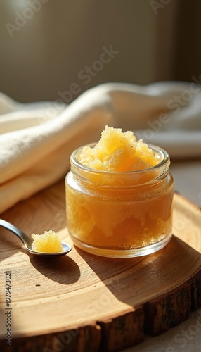 Golden body scrub in glass jar on wood. Spoon with scrub rests nearby. Soft fabric and natural light create calming spa ambiance. Product for smooth skin.