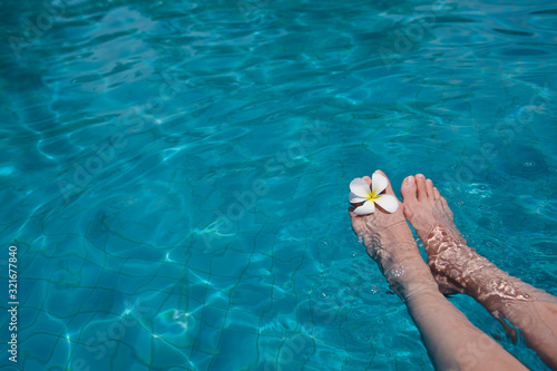 Tropical flowers with foot in swimming pool