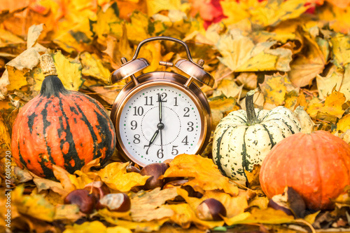 Clocks in the UK go back one hour in Autumn. Selective focus of an Alarm clock with two bells surrounded by Autumn leaves, Gourds or small pumpkins and chestnuts. Horizontal Copy space