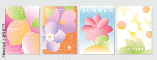 Modern gradient poster background vector set. Minimalist poster summer and spring cover template with green geometric, heart, flower, butterfly. Ideal design for social media, banner, card, ads.