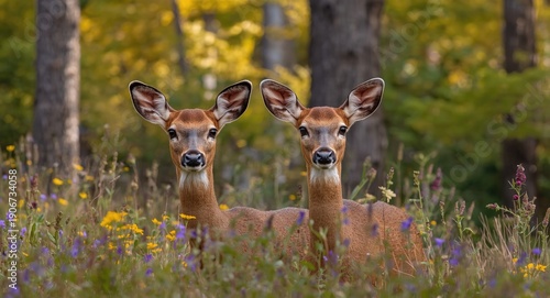 A couple of alert deer observing nature in a forest clearing