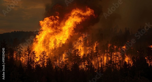 Fire engulfing forest with potential damage to natural habitat