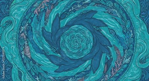 Vibrant teal and blue underwater scene. Whales, dolphins, and sea creatures swim amidst coral reefs. Aquatic life.