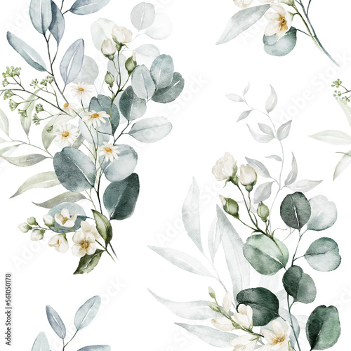 Seamless watercolor floral pattern - gold green leaves and branches composition on white background, perfect for wrappers, wallpapers, postcards, greeting cards, wedding invitations, romantic events.