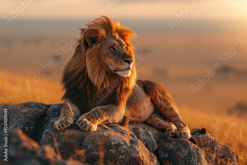 A majestic lion resting on a rock, bathed in warm sunset hues, symbolizing strength and beauty in the wild.