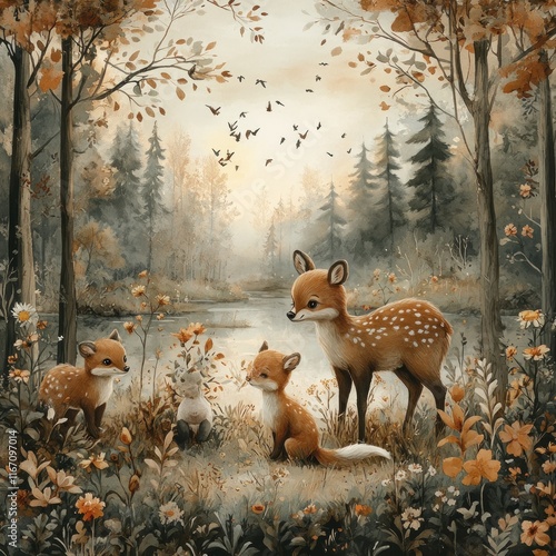 Watercolor Forest Animals Pattern Featuring Deer Bears Foxes and Bunnies with Butterflies for Nursery Decor