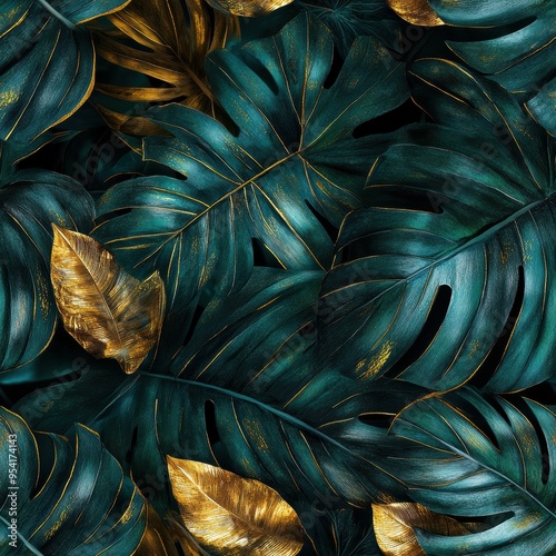 Lush tropical leaves in deep greens with gold veining for exotic luxury