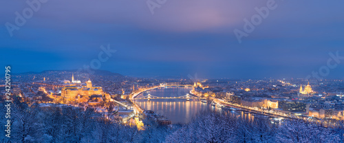 Danube river and Royal Palace in Budapest, winter night panorama