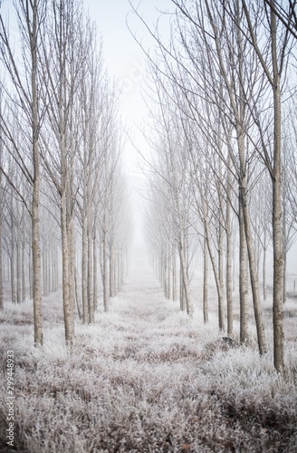 Vertical shot of breathtaking scenery of a forest with frosty bare trees - winter mystery