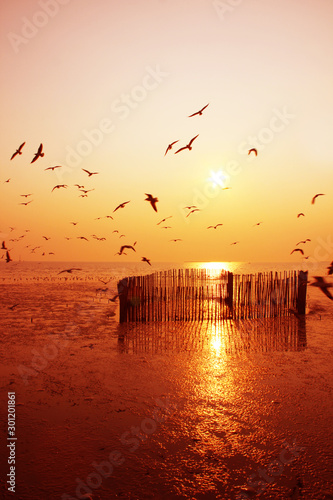 Beautiful nature landscape sunset and birds on the beach.