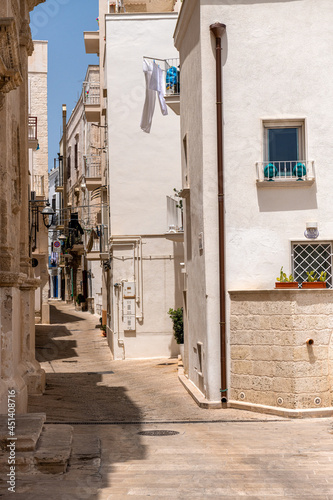 wąska uliczka miedzy kamienicami z białego kamienia, Monopoli, Puglia, Włochy