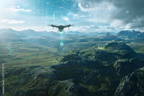 AI drone flying over a digital Earth landscape, scanning terrain with laser grids, futuristic environmental monitoring