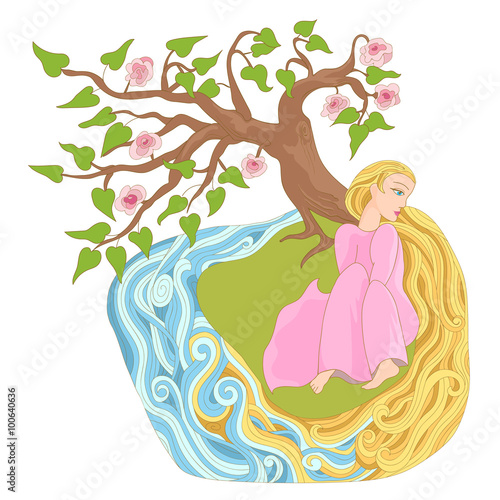 Dreamy girl with long hair on the river bank. Fairy story for stickers, posters and illustrations of children's books.