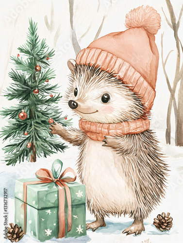 Adorable baby girl hedgehog watercolor illustration wearing light peach winter hat festive woodland Christmas scene cozy forest animal holiday artwork soft pastel aesthetic charming digital painting
