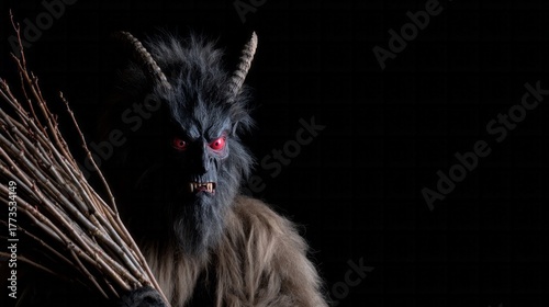 ```A shadowy Krampus creature clutches menacing switches, invoking Alpine folklore's eerie Yuletide traditions and the Krampusnacht celebration```