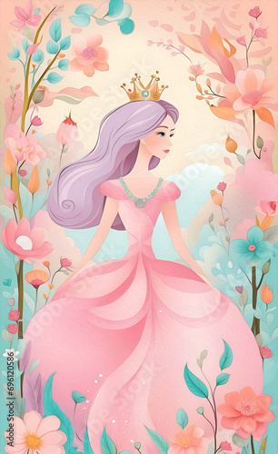 Little princess illustration. Floral frame. Baby Background. Wallpaper for girls. Fairytale princess.