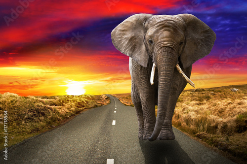 Elephant walking on the road at sunset