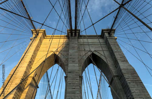 Brooklyn Bridge close up detail looking up at suspension cables at sunrise (beautiful landmark travel tourism destination in NYC) iconic New York City attraction over east river downtown Manhattan USA