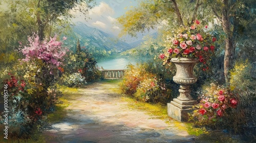 peaceful garden with blooming flowers and classical stone statue idyllic landscape oil painting