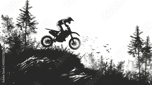 Silhouette of Motocross Rider Jumping Over Hill in Forest