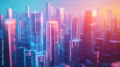 Concept of building a virtual city with holographic skycrapers. metaverse or augmented reality. 3d rendering. Holographic City. Illustration