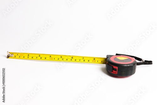 A black, red and yellow retractable tape with blank label. Measure held, measuring length, width and height concept, accuracy and precision. isolated on white background. copy space for text label