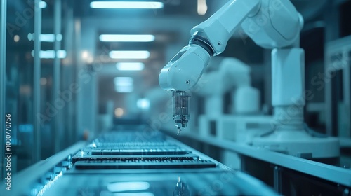 Precision robotic parts in motion within a smart factory, representing cutting-edge technology in industrial automation.